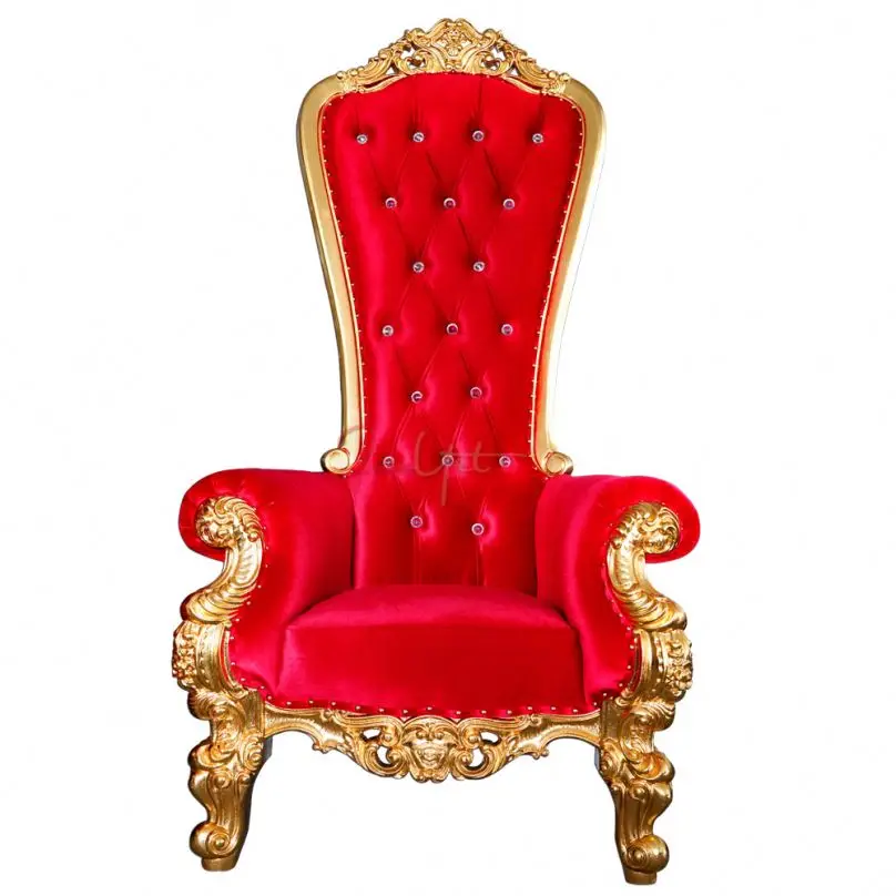 Queen Throne Chairs for Rental 36000-42000 Piece 1 Piece Min. Includes local delivery call for more details. It features a golden wooden frame and a high backrest red suede material.